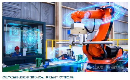 挤压产线迎来智能检测关键突破——新一代在线无损检测设备正式启用,实现铝材“CT式”精准诊断。设备集成可编程控制、边缘计算与数据闭环技术,探伤精度达AA级,依托360度旋转探头与六轴机械臂,实现管棒材全流程实时动态扫描,误检率低于1%,连细微裂纹、分层等隐蔽缺陷也难逃其“法眼”。相较于人工方式,检测效率提升90%,人力成本降低80%,实现缺陷判定、分拣、追溯全流程自动化与100%覆盖,年检测能力超万吨,为高附加值产品拓展筑牢质量根基。